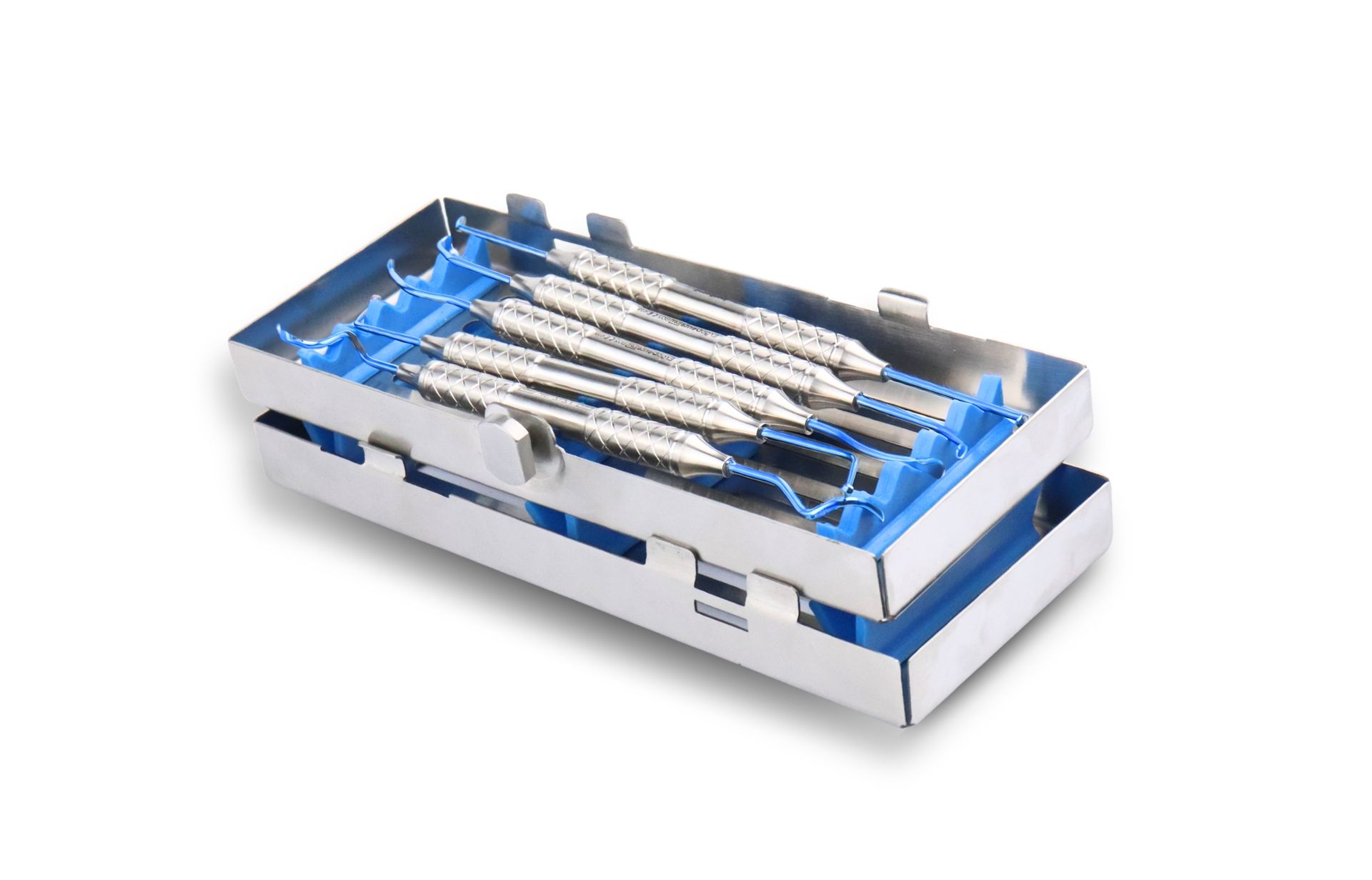 Five sinus-lift instruments in blue titanium coating, arranged in a sterilization cassette for organised handling and efficient preparation during sinus-lift procedures.